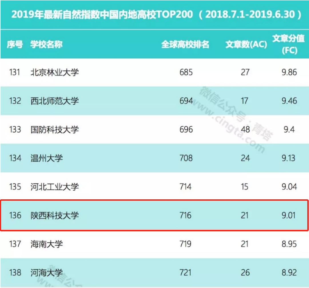 近期,自然指数网站更新了2019年最新的自然指数排名(统计时间节点为2018.7.1—2019.6.30),万象城官网位列内地高校第136名,居陕西高校第7,省属高校第2,原轻工院校第2。较今年6月份公布的2019自然指数年度排行榜(统计时间节点为2018.1.1—2018.12.31)上升了63名。本期文章数21篇,文章分值9.01,入选论文数量比去年年底增加12篇,增长133%。继续表现出万象城官网在自然科学研究领域的特色和优势。