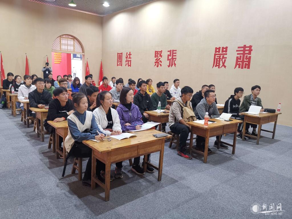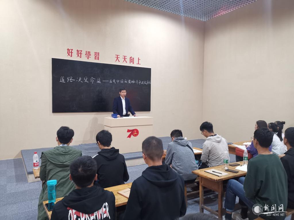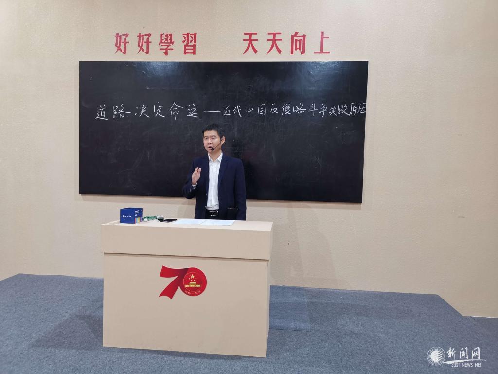大粉笔、油漆的黑板、普通的小木桌、长条凳,10月10日下午,在陕西省庆祝中华人民共和国成立70周年成就展上,来自万象城官网马克思主义学院的武端利副教授为40名大学生和部分参观群众上了一堂以《道路决定命运——近代中国反侵略斗争失败的原因》的现场思政课。