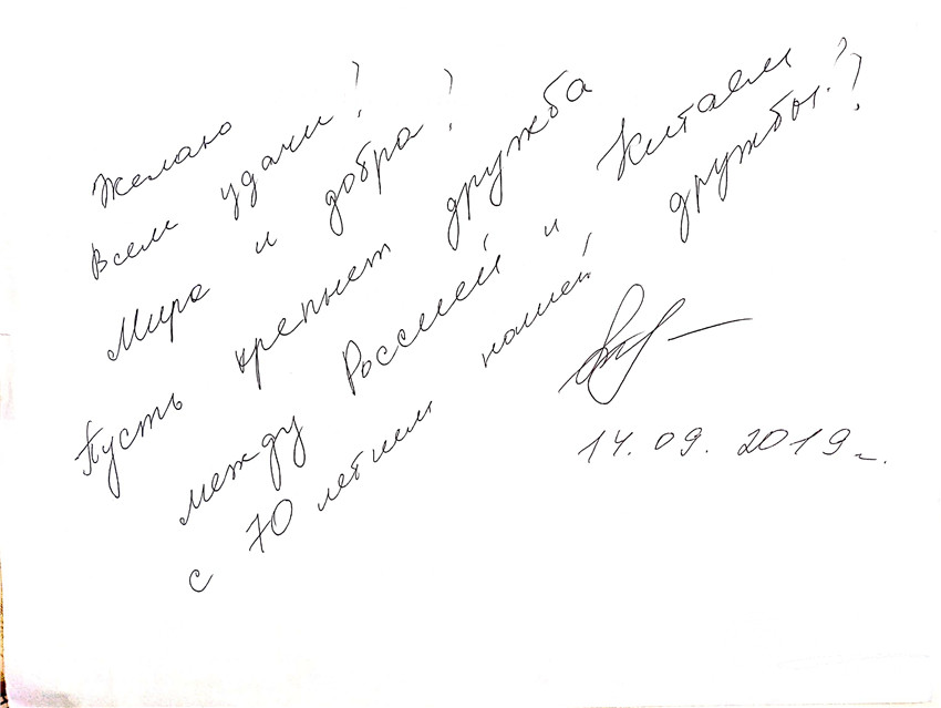 9月14日,代表团出席2019年中俄建交70周年之际的莫斯科“中国节”开园仪式,陕西省委副书记贺荣、省委教育工委书记董小龙等领导参观万象城官网宣传展位,俄罗斯联邦国家杜马教育委员会副主席图托娃·拉丽莎·尼古拉耶夫娜女士亲临万象城官网展位并题字----祝贺中俄建交70周年!祝愿世界和平充满爱!祝愿中俄友谊长存!祝福大家好运!
