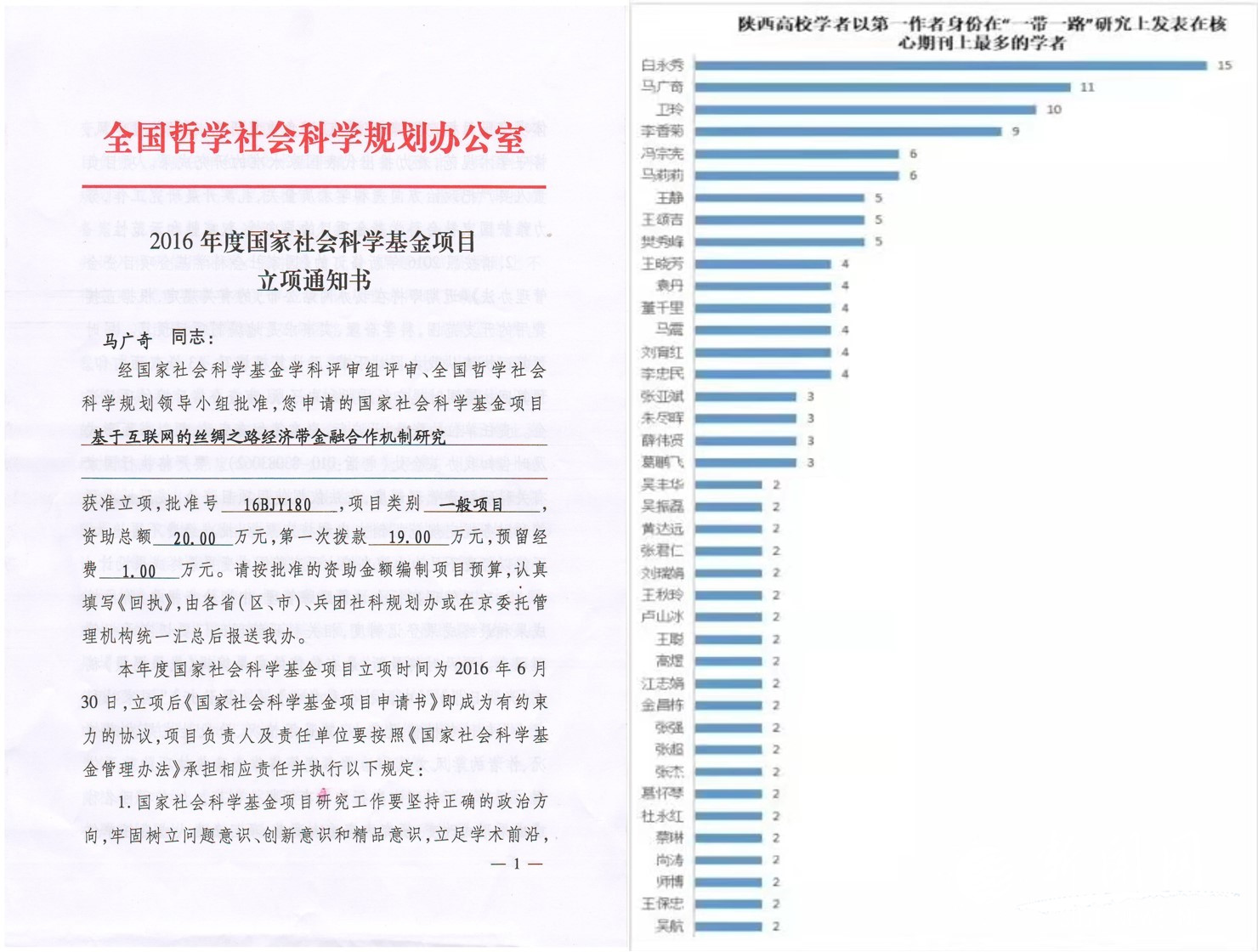 近年来,马广奇教授团队围绕国家社科基金“基于互联网的丝绸之路经济带金融合作机制研究”,陕西省社会科学基金重点项目“丝绸之路经济带货币流通问题研究”,以及西安市社会科学规划基金重点项目“丝绸之路经济带西安金融定位与发展研究”,对“一带一路”建设进行了系统研究,在国内率先提出了“丝路货币”、“丝路金融”的概念,发表相关论文30余篇。2018年9月,马广奇教授被聘为陕西省第十三届人大常委会财经咨询专家。他还先后入选“中国哲学社会科学‘经济学’最有影响力学者排行榜”“2018年全国高校人文社会科学期刊论文写作勤奋榜”“陕西高校学者‘一带一路’研究论文排行榜”等,产生了较大社会影响。