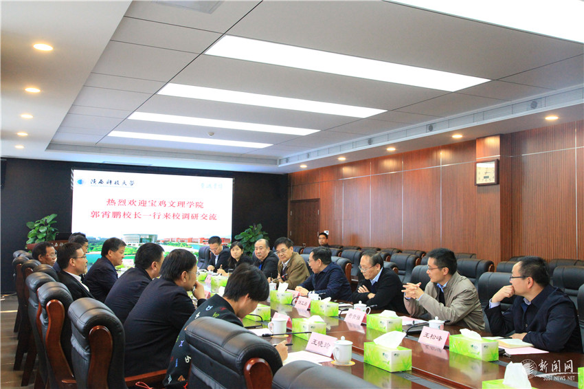 郭霄鹏回顾了自己在陕科大的任职经历,表示此次回到学校非常高兴和激动,离开学校后也一直密切关注陕科大的发展。他介绍了宝鸡文理学院“三易校名、三迁校址”的曲折办学历史、基本情况、正在进行的“创大更名”、新校区建设两项重点工作以及在人才培养等方面取得的发展成绩。他表示,近几年陕科大各方面工作发展迅速,取得了很大的进展,省委组织部、教育工委等多次邀请姚书记作经验交流,希望通过此次调研交流学习陕科大在人才引进、教学科研、内部管理等方面的先进经验和具体做法,进一步加强两校相关职能部门的对接交流,使宝鸡文理学院从辉煌的过去走向光明的未来。