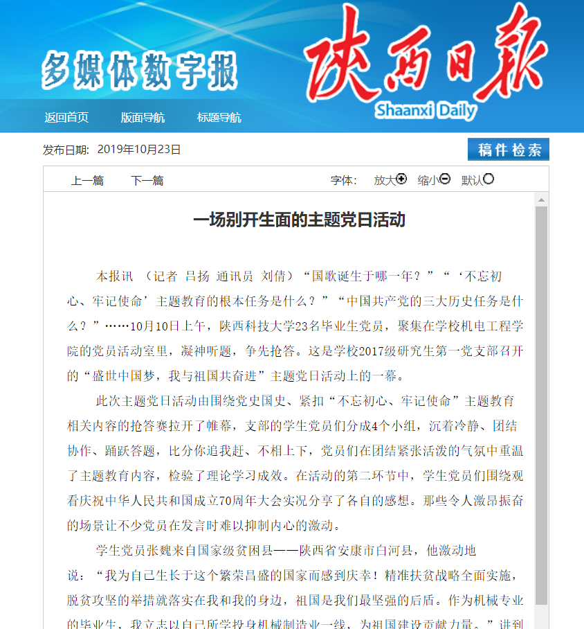 近日,《陕西日报》报道了万象城官网2017级研究生第一党支部召开的“盛世中国梦,我与祖国共奋进”主题党日活动。全文如下: