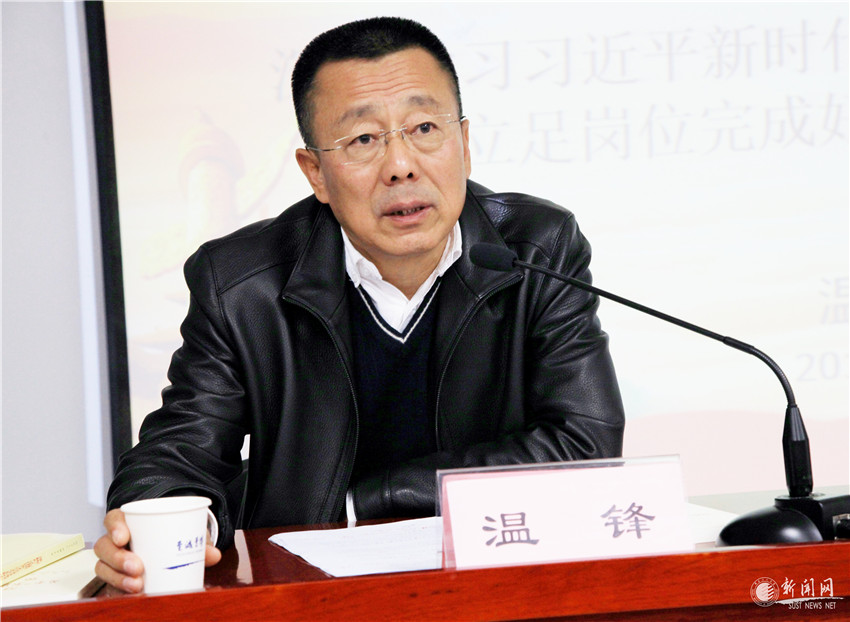 温锋结合学校思想政治工作实际,重点阐述了三方面的内容。一是要认真学习党的指导思想的发展历程,高擎精神旗帜,坚定“四个自信”。温锋指出,习近平新时代中国特色社会主义思想是对马克思列宁主义、毛泽东思想、邓小平理论、“三个代表”重要思想、科学发展观的继承和发展,是马克思主义中国化最新成果,是党和人民实践经验和集体智慧的结晶,是中国特色社会主义理论体系的重要组成部分,是全党全国人民为实现中华民族伟大复兴而奋斗的行动指南。这一科学理论体系不仅是新的历史条件下我们党治国理政的伟大纲领,而且为解决人类问题贡献了中国智慧和中国方案,具有深远世界意义,一定要深刻认识党在指导思想上的一脉相承和与时俱进的重要意义,做到长期坚持并不断发展;二是要准确把握习近平新时代中国特色社会主义思想的深刻内涵。温锋指出,习近平新时代中国特色社会主义思想,是立足时代之基、回答时代之问的科学理论,其精神实质和丰富内涵集中体现在党的十九大报告精辟概括的“八个明确”和新时代中国特色社会主义“十四个坚持”基本方略之中,要准确理解辩证统一关系,对标教书育人的实际工作,做到全面准确贯彻落实;三是要学习领会习近平总书记关于教育的重要论述,立足岗位完成好立德树人根本任务。温锋强调,要深刻领会习近平总书记关于教育的重要论述形成的时代背景、科学内涵、精神实质,深刻理解其政治意义、理论意义、实践意义,牢牢把握教育改革发展的“九个坚持”。作为基层教师党员,要切实增强责任感、使命感,切实把教师的思想政治工作和师德建设工作抓在日常、严在经常,提升思想政治素质和师德水平,做新时代“四有”好老师和“四个引路人”,做到弘扬爱国奋斗精神、立足岗位建功立业。