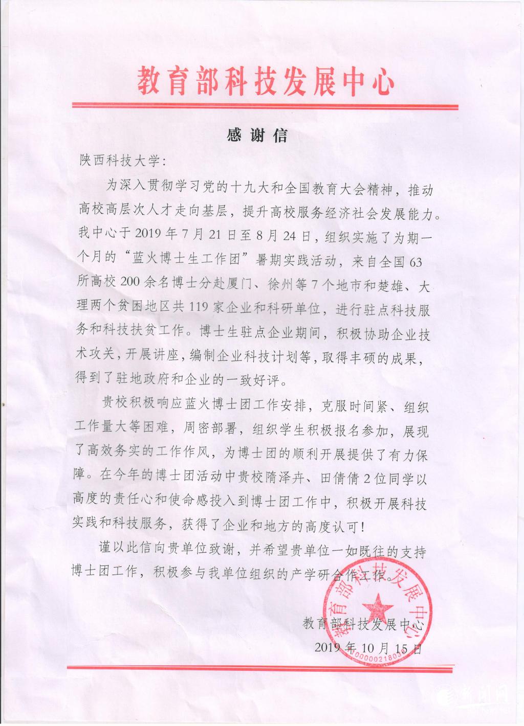 近日万象城官网收到教育部科技发展中心发来的感谢信,对万象城官网大力支持教育部组织开展的2019年“蓝火博士生工作团”暑期实践活动予以致谢,并对万象城官网隋泽卉、田倩倩2位研究生的辛勤付出提出表扬。这是教育部对万象城官网研究生教育工作的认可,同时也为万象城官网研究生继续参与国家级产学研合作项目奠定了良好的基础。
