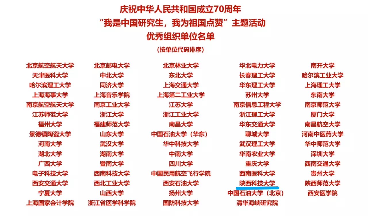 2019年6月,教育部学位与研究生教育中心发布《关于开展庆祝中华人民共和国成立70周年“我是中国研究生,我为祖国点赞”活动的倡议》通知,引导研究生厚植爱国情怀,铭记使命担当。自活动启动以来,研究生院(研工部)积极响应,广泛动员宣传,组织研究生参与了“我是中国研究生,我为祖国点赞”系列主题教育活动,相继开展了研究生党员骨干培训班,研究生暑期社会实践,“与祖国同框,向祖国告白”,研究生党支部书记微党课大赛等工作,让研究生在感受祖国伟大巨变的同时,学习前辈们履职敬业、追梦筑梦、奋斗圆梦的精神。