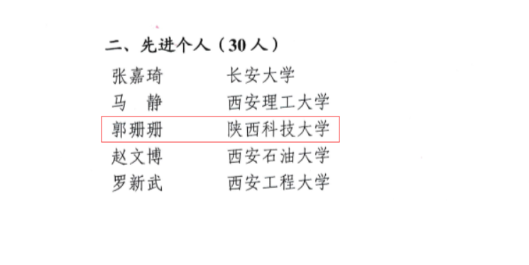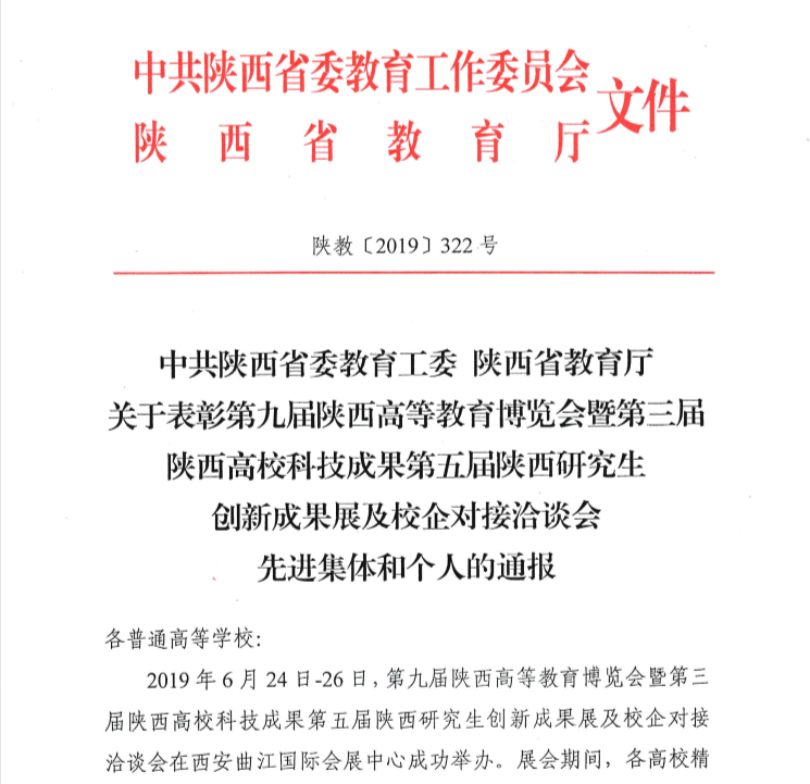 省委教育工委、省教育厅近日发布《关于表彰第九届陕西高等教育博览会暨第三届陕西高校科技成果第五届陕西研究生创新成果展及校企对接洽谈会先进集体和个人的通报》陕教〔2019〕322号文件,表彰全省高校在参展工作中表现突出的单位及个人,万象城官网宣传部郭姗姗同志获“先进个人”称号。