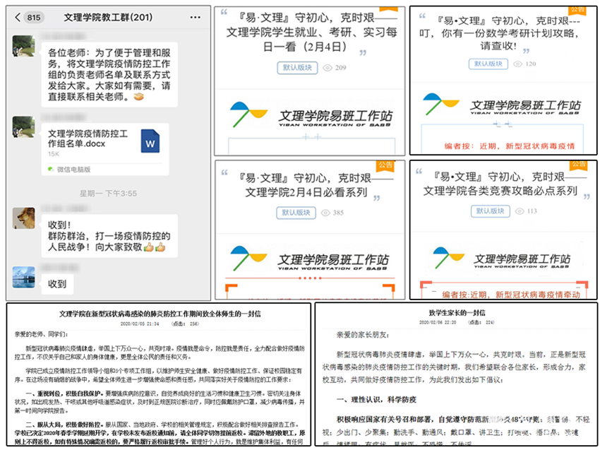 学院成立由院党委书记、院长任组长,领导班子成员、各系(办公室、教研室)主任、各党支部书记为成员的防疫工作领导小组,下设疫情监测、隔离帮扶、宣传教育、综合管理、学生疫情防控工作组等五个专项工作组,各系及办公室也分别成立工作小组,以维护师生安全健康、做好疫情防控工作为目标。学院发出《文理学院在新型冠状病毒感染的肺炎防控工作期间致全体师生的一封信》、《文理学院致学生家长的一封信》,动员全体师生及学生家长,增强责任意识,共同做好疫情防控工作。各支部带领党员、积极分子主动担当责任,发挥模范先锋作用。研19学生党支部将防疫期间疫情、国情、校情实时整合,形成“每日必看信息系列”;信息学生党支部将春招信息与考研复试信息有效整合、每日推送;数学学生党支部整理分享学长学姐考研、就业准备;物理及英语学生党支部整合各类竞赛攻略推送。
