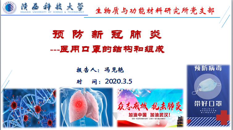 活动共分两个阶段。首先,党支部书记冯见艳同志带领全体党员对近期疫情防控的相关政策精神进行了学习。而后,她结合轻工学院特色专业非织造材料与工程相关知识,主讲了题为《预防新冠肺炎—医用口罩的结构和组成》的“云党课”。党课对口罩——这一特殊时期必备物品,从专业的角度进行“解剖”分析,重点对其无纺布材料组成及熔喷生产、防护机理及生产流程等进行解读,逐步把话题引向深入理解党中央“科学防控”主线,激励支部党员将所学专业与战“疫”相结合,奉献在前,学习在即,共抗疫情。