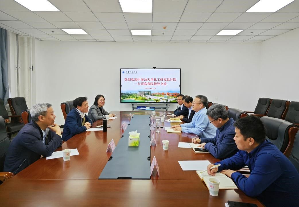 郭军康对滕厚开一行的来访表示热烈欢迎,并从办学历史、学科方向及特色、科学研究、师资队伍、人才培养等方面介绍了学院总体情况。滕厚开介绍了中海油天津化工研究设计院的发展沿革、科研平台、技术创新、产学研融合及学术期刊建设等方面情况,他表示,环境学院近年来发展所取得的成绩令人振奋,双方科研方向契合度高、合作面广,期待在相关领域开展密切合作,实现优势互补、互利共赢。双方还围绕碳减排技术、固废资源化、新兴污染物监测与控制等议题以及学术交流、成果转化、人才联合培养等方面进行了深入交流。