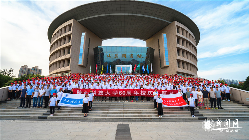 培训会开始前,全体志愿者在图书馆南广场合影留念,“世界小,陕科大”——铿锵有力、充满自信的口号,展现了校庆志愿者迎接校庆的饱满热情和良好的精神状态。