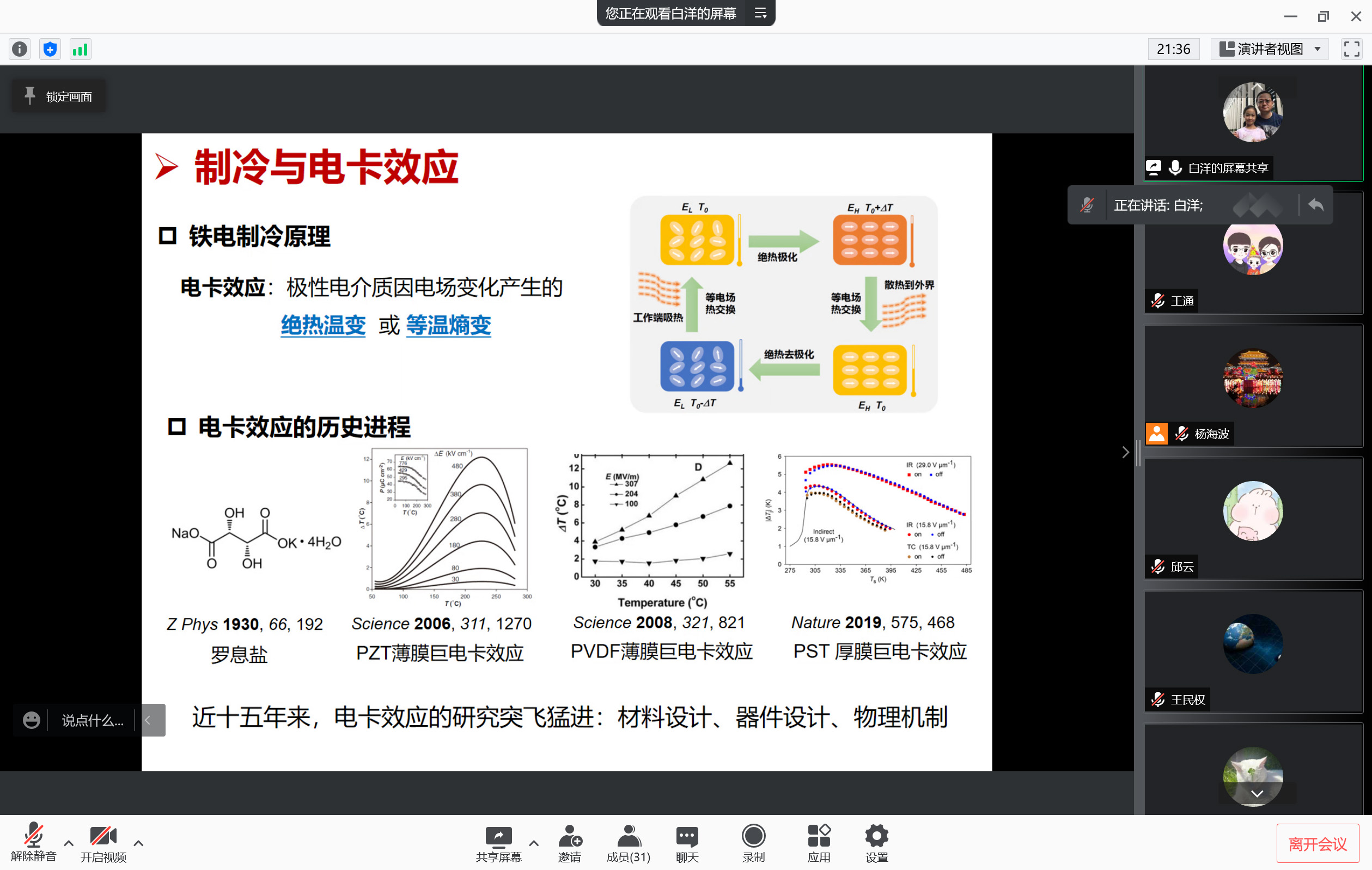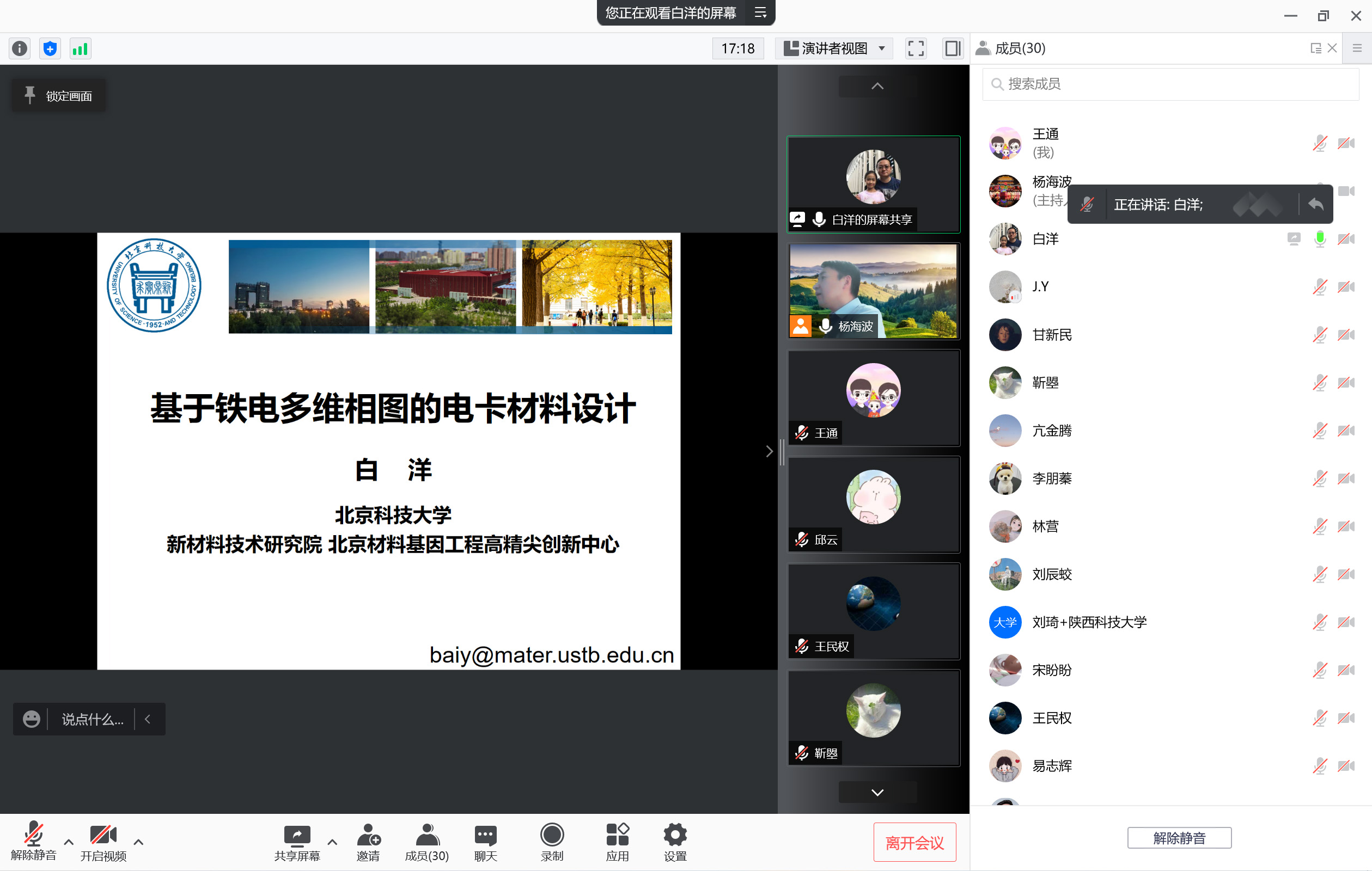 1月18日上午,应万象城官网材料科学与工程学院邀请,北京科技大学白洋教授做客万象城官网前沿科学报告,作了题为“基于多维铁电相图的电卡材料设计”的线上学术报告。材料学院相关专业师生参加了此次报告会,报告由教务处处长杨海波教授主持。
